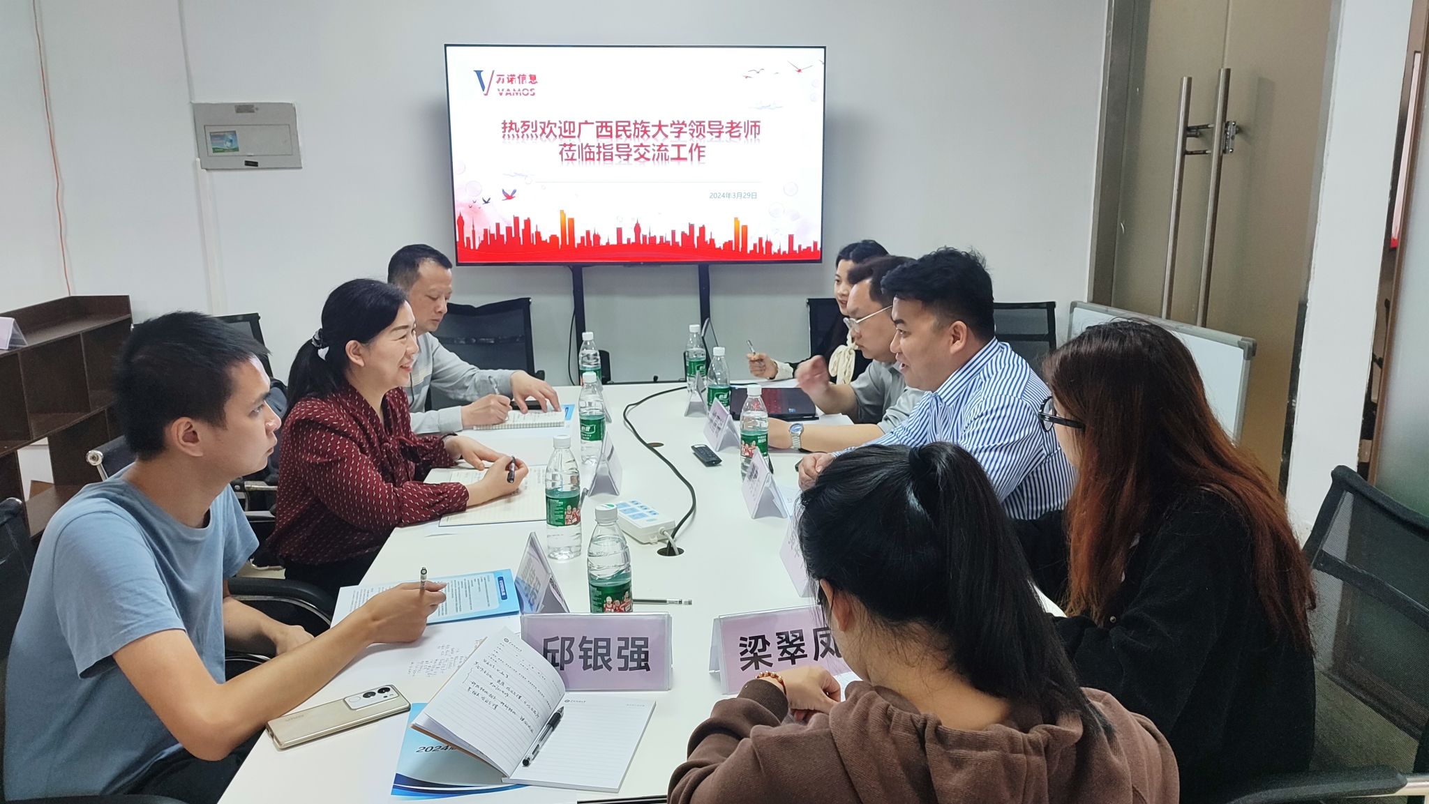 广西万诺信息技术有限公司总经理黄勇钊对公司到来访表示欢迎,并从公司的基本情况、人才需求、项目实施情况等介绍公司。他提到,通过校企合作,企业能更好挑选合适人才,公司能培养更贴近市场需求的员工,双方建立良好的沟通桥梁,一方面促进企业良好发展,另一方面也有益于公司的科研成果转化。