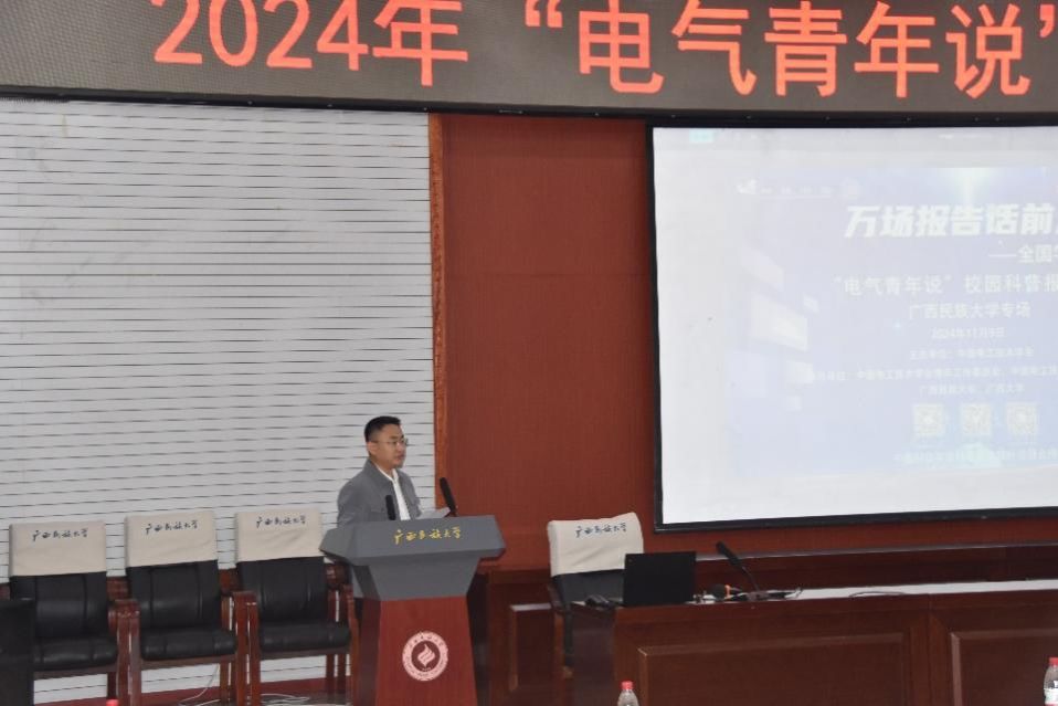 为激发青年员工的学习和科研热情,引导青年员工热爱电气工程学科,并鼓励他们未来投身电气相关行业,11月9日,“电气青年说”校园科普报告会在广西民族大学相思湖校区科技楼报告厅成功举办。本次报告会由中国电工技术学会主办,邀请了广西大学副教授张冬冬、香港科技大学研究助理教授尚一通、广西民族大学讲师王尧和广西大学博士研究生朱虹谕做分享交流。伟德国际victor1946罗少科老师、李旭老师及公司员工代表参加。