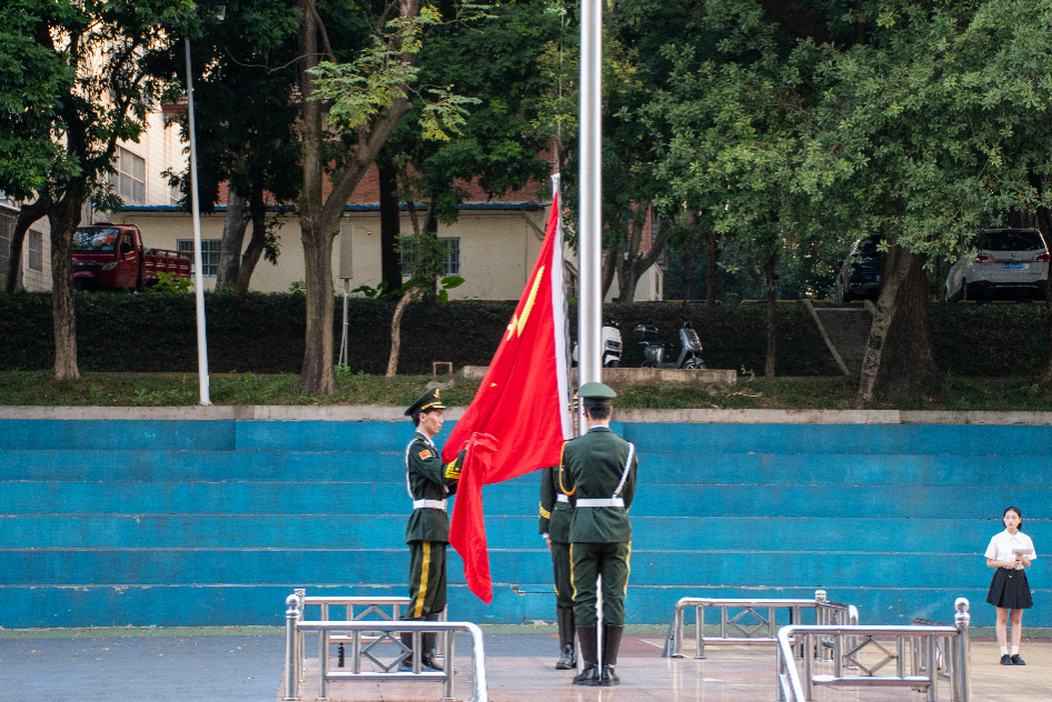 晨光熹微,7时20分,升旗仪式正式开始。国旗护卫队身着戎装,昂首挺胸,迈着整齐而坚定的步伐,护送鲜艳的五星红旗至升旗台。雄壮的国歌奏响,五星红旗冉冉升起,全体师生庄严肃立,高声共唱国歌,行注目礼。