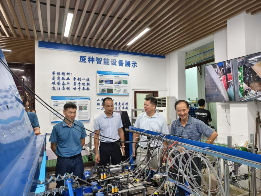 考察团一行在团队带头人二级教授李尚平、副经理文春明,自动化系专任教师廖义奎、赖晓、黄天星的陪同下,参观了公司智能装备研发中心实验室。团队带头人李尚平教授介绍了实验室研发的甘蔗智能备种生产线设备,并介绍这些智能设备在企业投产、交付、调试应用等有关情况。