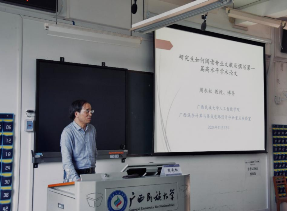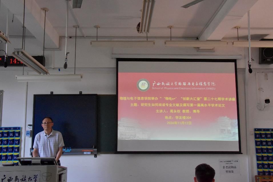 11 月 12 日下午,伟德国际victor1946于学友楼 304 顺利举办“‘物电 e+’创新大汇堂”第二十七期学术讲座。本次讲座聚焦“研究生如何阅读专业文献及撰写第一篇高水平学术论文”主题,由周永权教授主讲,副经理文春明主持,公司全体研究生参加。